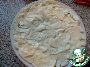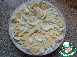Нарезаем вареные яйца тонкими слоями. Я слой делю ещё на половинки и укладываю кругом.