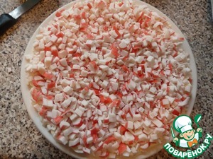 Нарезаем крабовые палочки на мелкие кубики и выкладываем следующим слоем.