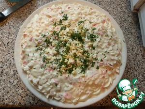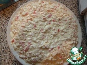 Смазываем крабовые палочки майонезом с солью - это будет последний слой.
