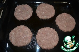 В фарш добавляем мелко нарезанный лук, яйцо, соль и перец по вкусу и перемешиваем. Формируем из фарша плоские кружки, выкладываем на смазанный маслом противень и жарим при температуре 200 гр до готовности