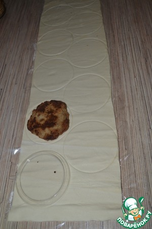 Готовое слоеное покупное тесто раскладываем (я не раскатывала) и вырезаем необходимое количество кружков (по два на котлетку) диаметром чуть больше самой котлетки (я крышкой от сметаны намечала)