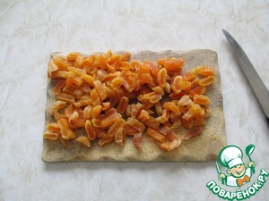 1) Прежде всего заливаем курагу кипятком, чтобы придать ей мягкость. Она должна резаться без усилий. Если курага и так мягкая, этот этап можно пропустить. Если жестковата - можно подержать в кипятке подольше. Но важно не передержать: курага должна отдать свой сок пирогу, а не кипятку!