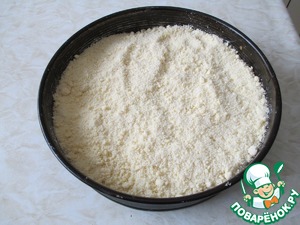 2) Муку, разрыхлитель, 150 грамм сахара и маргарин перетираем до однородной крошки (я это делаю руками)))