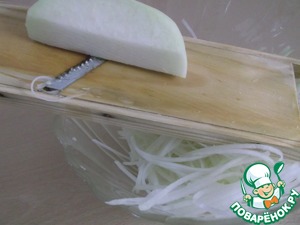 Кольраби моем, чистим и натираем на тёрке "корейская морковка". В оригинальном рецепте указывалась именна эта тёрка, т. к. вкус овощей при этой нарезке гармоничен и хрустящ.