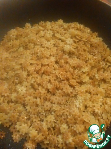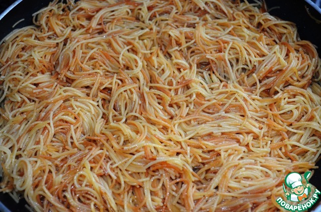 Залить большим стаканом воды так, чтобы вермишель полностью водой не покрывалась, посолить! Жарить до испарения воды, иногда помешивать.