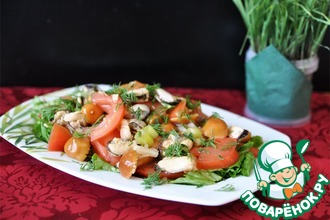 Помидоры нарезать тонкими кружочками. Зеленый лук нарезать кусочками длиной 1-1,5 см.