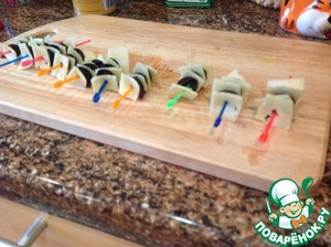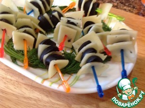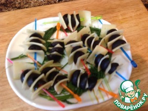 Потом нам надо будет 4 кусочка сыра и 3 половинки маслин на одну порцию. Затем всё соединяем в таком порядке: сыр, маслина, сыр, маслина, сыр, маслина, сыр. Я насадил всё это дело на палочку, как показано на картинке.