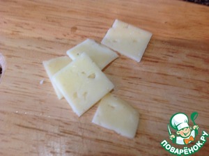 Потом разрезаем ломтики сыра (примерно на 1х1см).