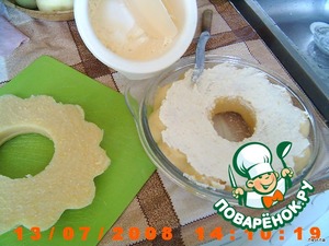 Поленту перевернуть и разрезать на три части. Я резала леской. Потому что было сказано, что в начале её желательно разлить в 3 формы.