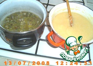 Отвариваем фасоль. В кастрюле вскипятить 1,5 л. воды, добавить соль. Размешивая венчиком всыпать крупу. Варить 25-30 минут, постоянно размешивать деревянной ложкой.