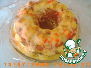 Положила на смазанную слив. маслом огнеупорную посуду (в рецепте было написано на смазанный слив. маслом пергамент)и положила в духовку. Выпекать при t=200* на 30 мин. За 10 мин. до готовности посыпала тертым голланским сыром и полила острым кетчупом.