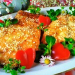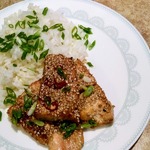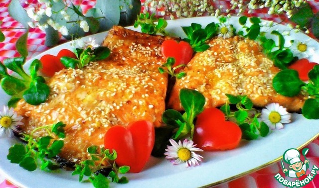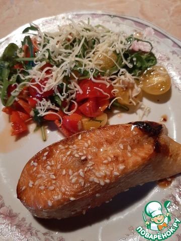 Выкладываем рыбу из маринада на противень, посыпаем семечками кунжута и ставим в разогретую до 250*С духовку, запекаем 10-15 минут.