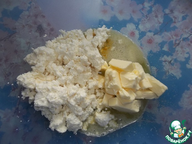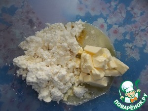 К этой смеси добавить творог, маргарин и куркуму.
