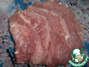 Режем мясо на куски и очень хорошо отбиваем.