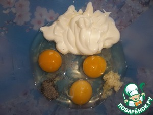 Смешиваем яйцо, майонез, чеснок и молотый черный перец.