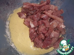 В смесь добавляем порезанное полосками мясо. Хорошо перемешиваем и отправляем в холодильник, минимум на 3 часа.