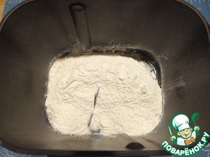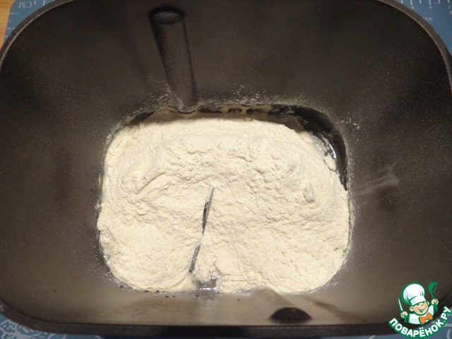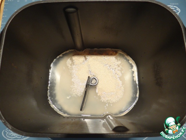 Тесто я, как и обычно, замешиваю с помощью хлебопечки, но можно тесто замесить и обычным способом. В ведерко хлебопечки наливаю теплую воду, добавляю сухие дрожжи, оставляю на 5 минут.