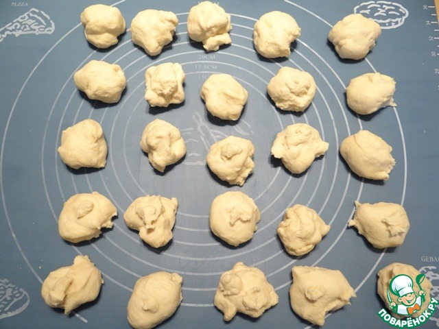 Делю тесто на маленькие кусочки (я делила на кусочки весом 22 грамма), накрываю их пленкой, чтобы тесто не засохло.