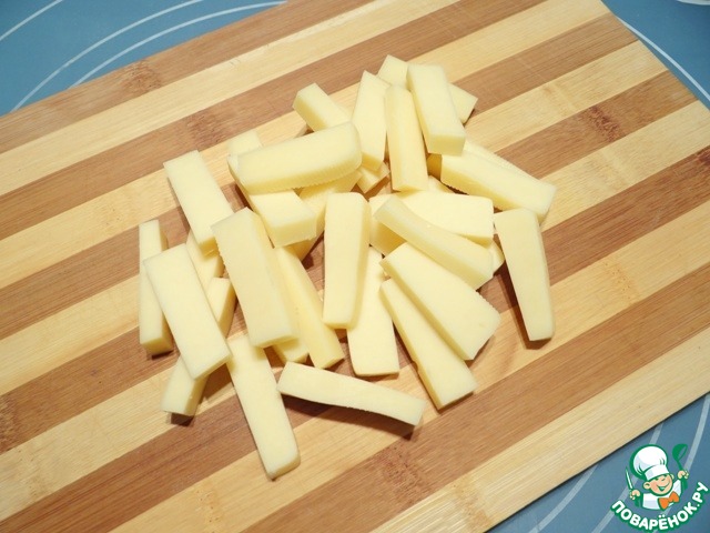 Нарезаю твердый сыр на небольшие брусочки.