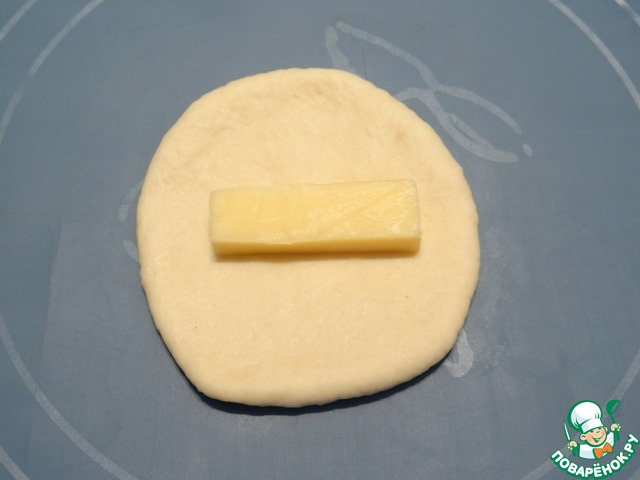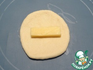 Беру кусочек теста, раскатываю в маленький кружок, кладу в середину брусок сыра.