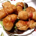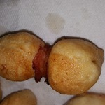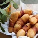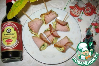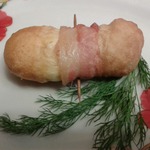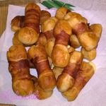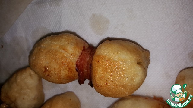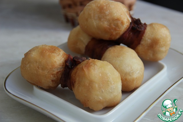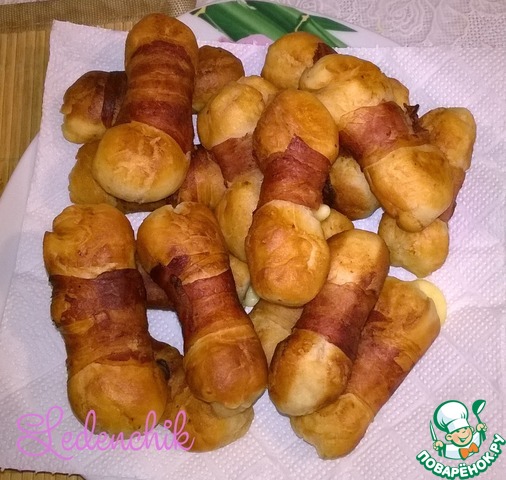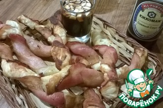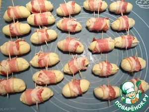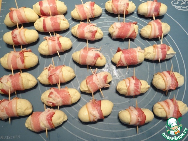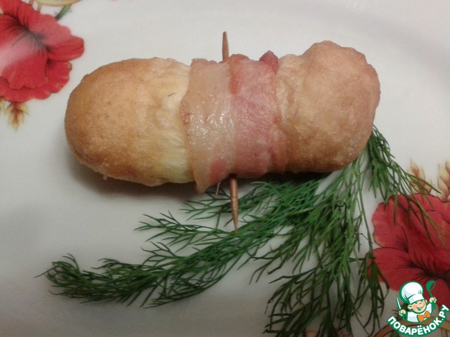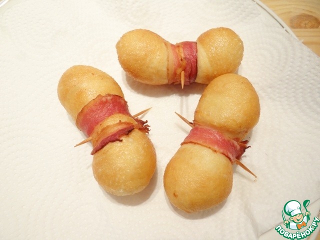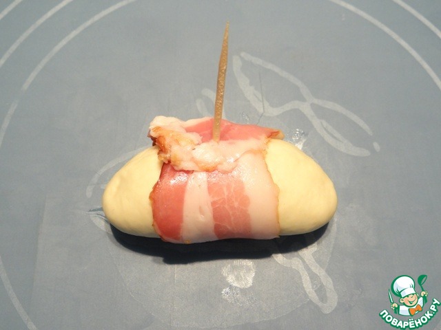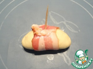 Оборачиваю тесто с сыром ломтиком бекона, но не туго, закрепляю бекон зубочисткой.