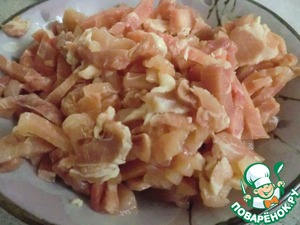 Курицу нарезать на мелкие кусочки и обжарить на сковороде.