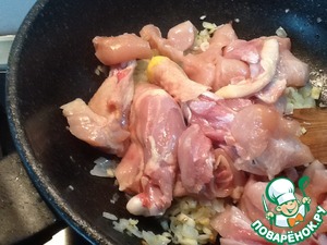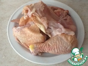 • Курицу разделать. Нам понадобятся ножки и мякоть. Разрезать на небольшие кусочки.