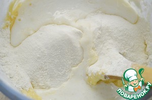 2. Муку просеять с крахмалом, разрыхлителем и солью. Кефир смешать с растительным маслом. В яичную смесь ввести половину муки и половину кефира. Перемешать лопаткой. Затем вторую половину муки и кефира. Перемешать.