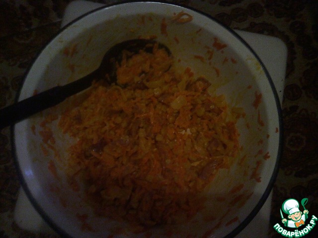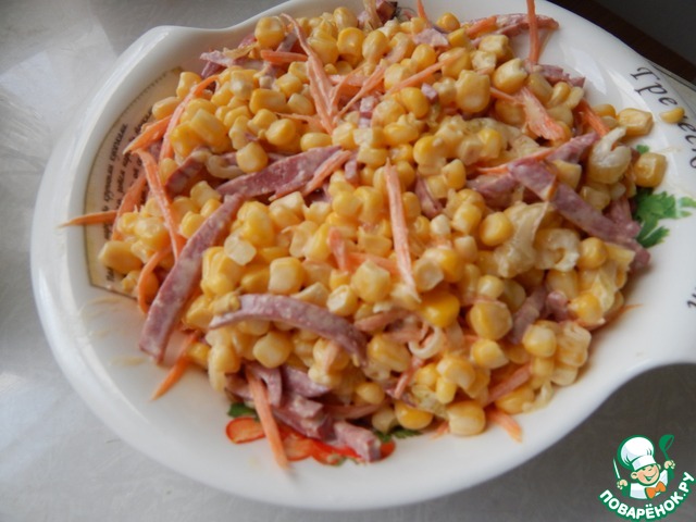 С кукурузы сливаем жидкость, добавляем к луку и моркови