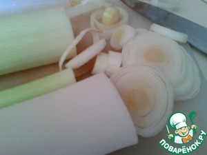 Лук-порей нарезать, положить в кастрюлю с разогретым маслом.