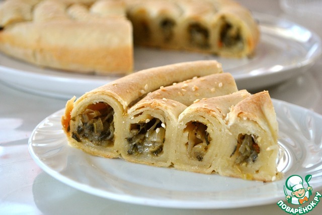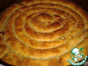 Укладываем в круглый противень по кругу. Не имеет значения, откуда вы начнете, из центра или с периферии противня. Уложенные плотно жгутики сверху смазываем маслом и посыпаем кунжутом. Выпекаем в духовке 180'С 20-25 мин.