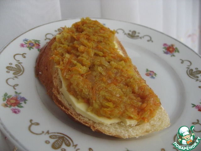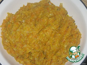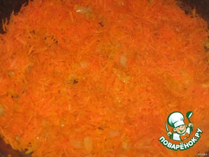 Как можно мельче порезать лук, натереть морковь на морковной терке. Сначала на растительном масле обжарить лук, потом добавить морковь, жарить еще минут 5, солим.