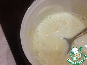 Вливаем в эту смесь горячее молоко и ставим на мелкий огонь. Постоянно помешиваем.