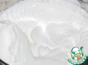 Белки и щепотку соли взбиваем миксером до загустения. Затем добавляем 2 столовые ложки сахара и взбиваем пока крем не станет совсем густой. -