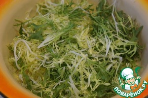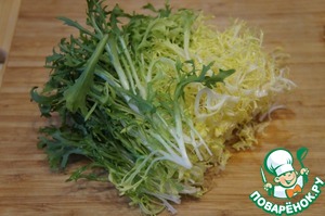 • Салат промыть под проточной водой, дать хорошо стечь на чистой салфетке. Разобрать на отдельные листочки и сложить в глубокую миску.