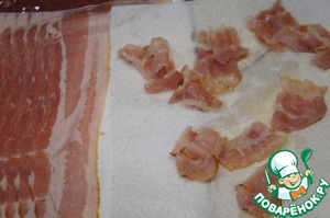 • Полоски бекона разрезать поперек на 4 части и обжарить на сухой сковороде до хрусткости. Выложить на бумажную салфетку, чтобы стек лишний жир. Бекон лучше выбрать попостнее.