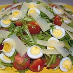 В небольшую баночку влить масло и сок, добавить соль и перец, закрыть крышкой и хорошенько встряхнуть несколько раз. Полить салат получившейся заправкой. Сверху разложить половинки перепелиных яиц и разбросать хлопья пармезана.