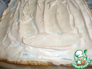 Через 20 мин., на горячий пирог выложить безе произвольно. Если выложить с помощью кулинарного шприца, будет красиво и празднично.