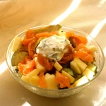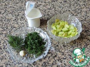 Измельчить укроп, чеснок растереть. Огурец очистить от кожуры (если семена крупные - удалить), нарезать как яблоко и авокадо. Все компоненты соединить и заправить йогуртом - он смягчит вкус соленой рыбки и не забьет вкус авокадо.
