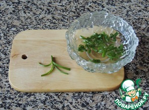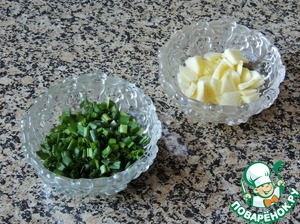 Мелко покрошить зеленый лук (несколько перьев оставить для украшения). Яблоко очистить от кожуры и семян, нарезать как авокадо.