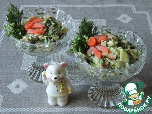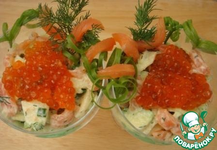 Салат подавать порционно, украсив луком, укропом и кусочками рыбы. Для праздничного варианта можно выложить на салат немного красной икры.