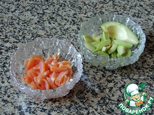 Рыбу (можно использовать обрезки или недорогие наборы "к пиву") нарезать небольшими ломтиками. Авокадо (не слишком мягкий) освободить от шкурки и косточки, разделить на четвертинки, каждую нарезать тонкими слайсами.