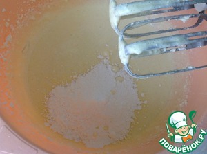 Добавляем 4 взбитых не очень сильно белка и перемешиваем