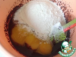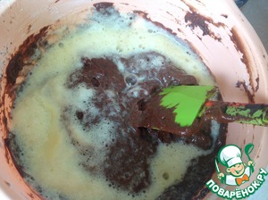К остывшей шоколадной массе добавляем 4 желтка, разрыхлитель и муку. Вымешиваем тесто лопаткой, не взбиваем