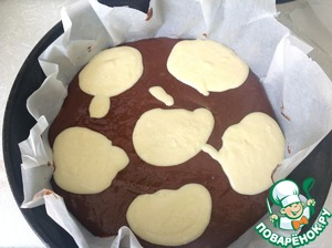 В форму выстеленную пекарской бумагой выливаем треть теста и произвольно ложкой выкладываем творожную начинку