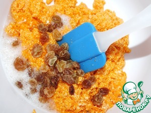 Морковь натереть на мелкой терке, потушить в молоке, добавить корицу. Затем перемолоть в блендере с 50 гр творога. Добавить взбитый вилочкой белок и немного изюма.