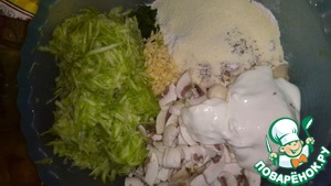 Всё смешиваем в одной посуде, в том числе и отжатый от сока кабачок потёртый. Если нужно можно подсолить, но с учётом того что сыр тоже солёный.