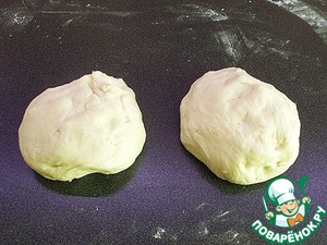 Разделил колобок на две примерно равные части. Одна часть станет основой каравая, из другой будут изготовлены украшения. Основу я немного покатал по столу и выложил на противень, смазанный маслом. Немного приплюснул и оставил расстаиваться.