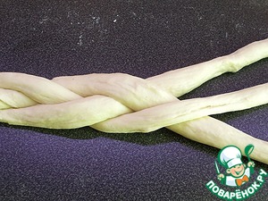 Из части теста сделал три жгутика и сплёл косичку. Длина косички довольно большая - она будет обрамлять каравай по краю.