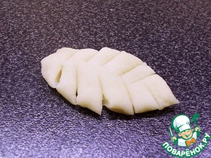 Сделал несколько листиков. Сначала раскатывается овал, а затем ножом прорезаются на нём характерные жилки.